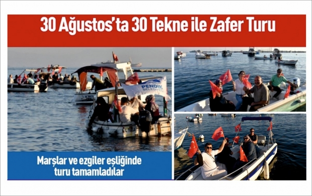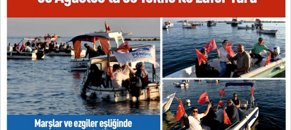 Pendik Belediyesi “30 Ağustos Zafer Bayramı etkinlikleri" kapsamında “Nostaljik Kayıkla Zafer Turu” düzenledi. Etkinlik kapsamında 150 kişi, 30 tekneyle “zafer turu” attı. Tura katılan Pendikliler ellerinde Türk Bayraklarıyla marşlar söyleyerek 30 Ağustos Zafer Bayramı’nı denizde kutlamış oldu.
