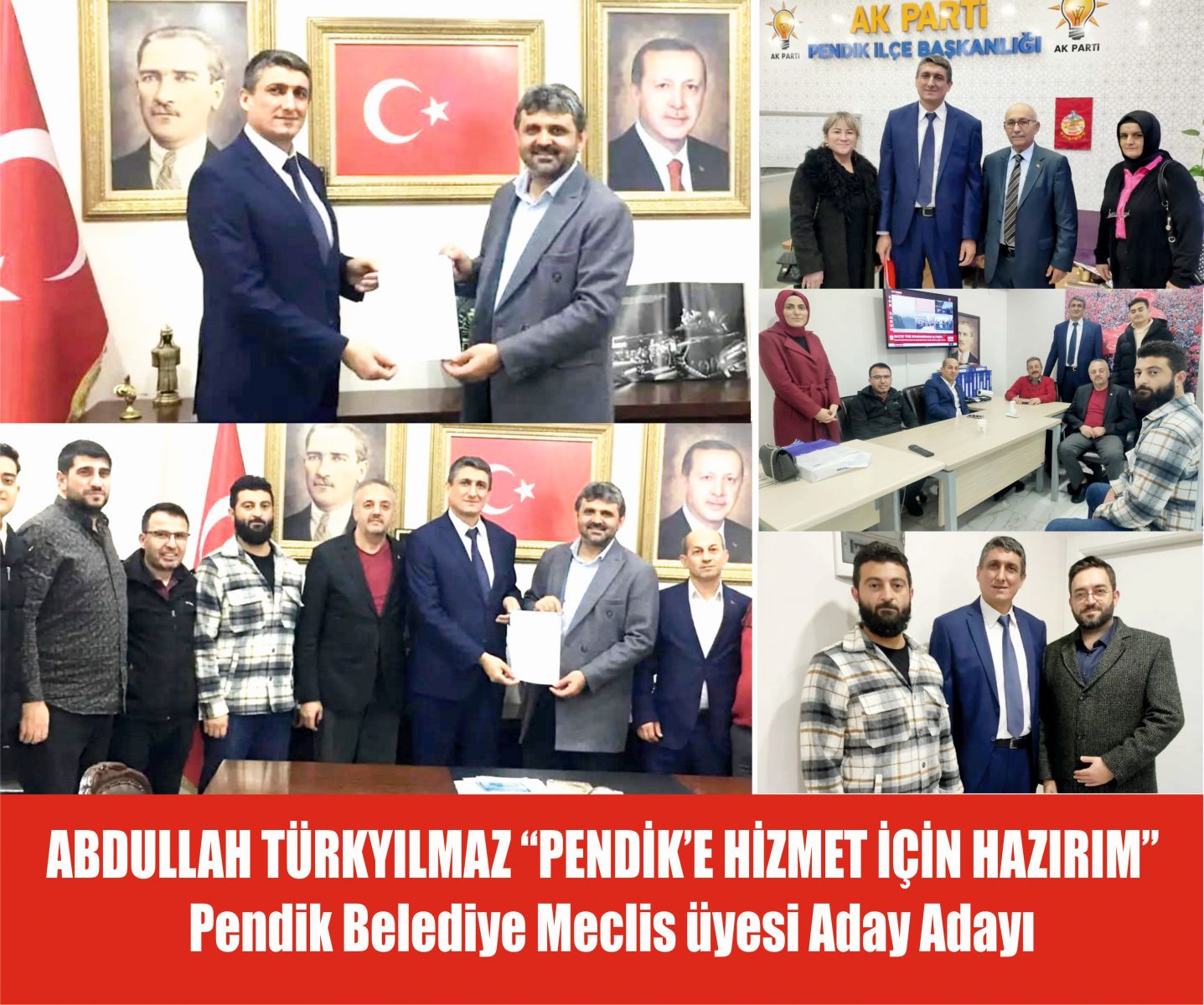 AK Parti'nin kuruluşundan bu güne kadar Pendik teşkilatının üyesi olarak, Bahçelievler ve Yeni Mahalle teşkilatlarında; Teşkilat Başkanlığı, Seçim işleri Başkanlığı,. Tanıtım Medya., Sosyal Politikalar, Yerel yönetimler Başkanlıklarında görev yaptım. Yaklaşık 22 yıldır bu teşkilatın içinde özverili bir şekilde,üzerime düşen görevleri yerine getiren Abdullah Türkyılmaz 31 Mart 2024 tarihinde yapılaçak olan mahalli seçimlerinde Pendn Belediyesi Meclis Üyeliği aday adaylığını açıkladı.