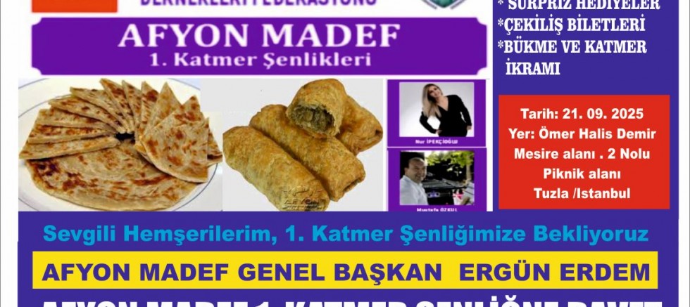 Afyon Madef 1. Katmer şenliği ile ilgili federasyon başkanı Ergün Erdem yaptığı açıklamada, Afyon Madef olarak Federasyonumuz Afyonkarahisarlı hemşerilerin birlik, beraberlik içerisinde Afyonkarahisar'ın kültürel değerlerini ve yöresel lezzetlerini tanıtmayı hedeflediğini belirtti.
