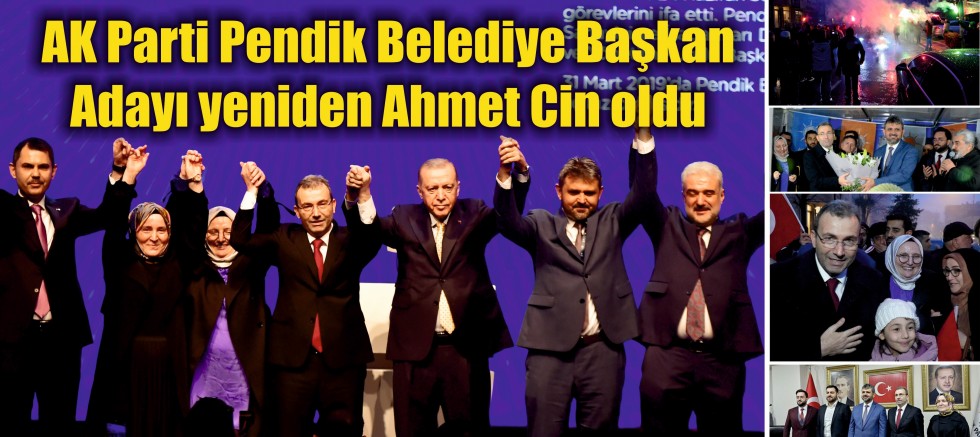 Cumhurbaşkanı Recep Tayyip Erdoğan, AK Parti İstanbul İlçe Belediye Başkan adaylarını açıkladı. AK Parti Pendik Belediye Başkan Adayı yeniden Ahmet Cin oldu. Belediye Başkanı Ahmet Cin: “5 yıl boyunca gözle görülür işler yaptık. Şimdi yeni işler zamanı. Yine birlikte Pendik’e yeni hizmet ve eserler kazandırma zamanı.” dedi.