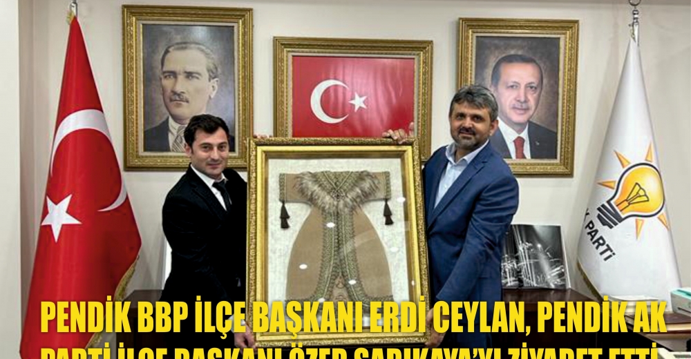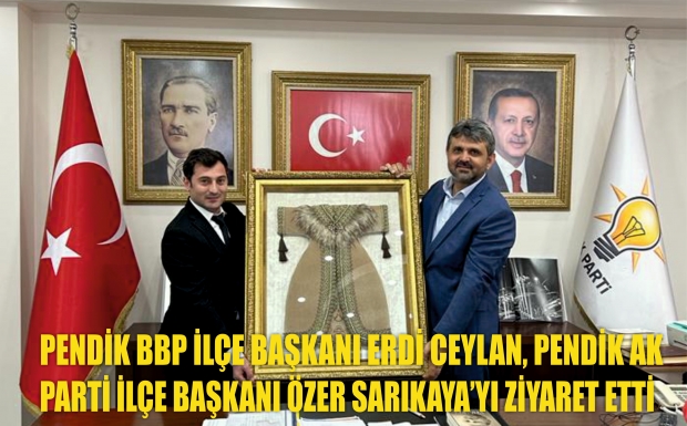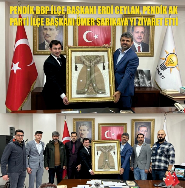 BBP (Büyük Birlik Partisi) Pendik ilçe başkanı Erdi Ceylan Pendik AK Parti İlçe Başkanlığına yeni atanan Özer Sarıkaya'yı makamında ziyaret ederek hayırlı olsun dedi. BBP Pendik BBP ilçe başkanı Erdi Ceylan ve yönetimi Pendik AK Parti ilçe Başkanı Özer sarıkaya'ya görevinde başarılar diledi ve kendisine bir tablo hediye etti. Pendik AK Parti İlçe başkanı Özer Sarıkaya, Kendilerine ziyarete gelen BBP Pendik İlçe başkanı Erdi Ceylen ve ekibine ziyaretlerinden dolayı teşekkür etti, Başkan Özer Sarıkaya, Pendik BBP ilçe başkanı Erdi Ceylan'a partisinin çalışmaları hakkında bilgi sundu.