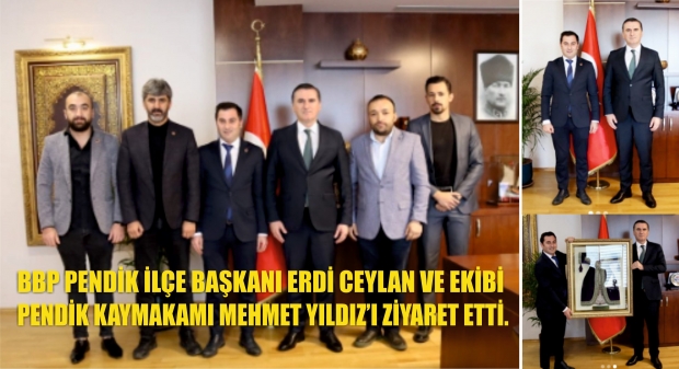 BBP (Büyük Birlik Partisi) Pendik ilçe başkanı Erdi Ceylan Pendik Kaymakamı Mehmet Yıldız,ı makamında ziyaret ederek hoş geldiniz dedi. BBP Pendik BBP ilçe başkanı Erdi Ceylan ve yönetimi Pendik kaymakamlığına yeni atanan Mehmey Yıldız'a görevinde başarılar diledi ve kendisine bir tablo hediye etti. Başkan Erdi Ceylan Kaymakam Mehmet Yıldız'a misafirperverliklerinden dolayı teşekkür etti. Kaymakam Mehmet Yıldız, BBP Pendik İlçe başkanı Erdi Ceylen ve ekibine ziyaretlerinden dolayı memnuniyetini dile getirerek, çalışmalarında başarılar diledi.