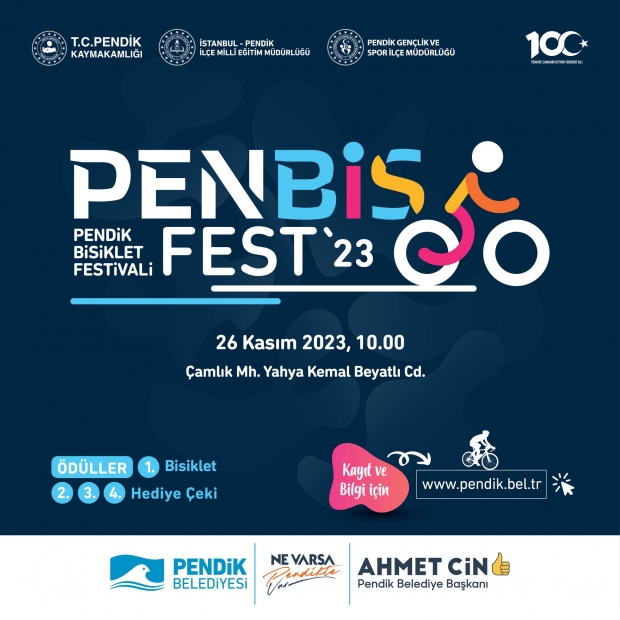 Yarışma Tarihi: 26 Kasım 2023 Pazar Yarışma Saati: 10.00 Kayıtlar: 7 Kasım –23 Kasım 2023 Numara ve Tişört Dağıtım: 16 Kasım Perşembe – 23 Kasım Perşembe (11.00-19.00) Numara ve Tişört Dağıtım Yeri: Mehmet Akif Ersoy Sanat Merkezi Önü Saat: 11.00-19.00 Arası Ödüller: Bisiklet Ödülü Hediye Çeki Ödülü Hediye Çanta Detaylı bilgi ve kayıt için; https://www.pendik.bel.tr/.../2023-pendik-bisiklet-festivali