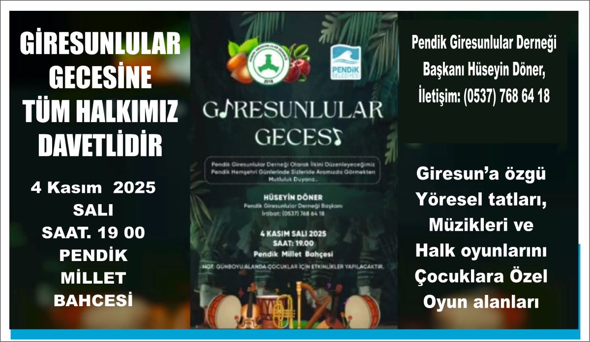 Etkinlik takviminin bir sonraki durağı Giresun olacak. Pendik Giresunlular Derneği tarafından düzenlenecek “Giresunlular Gecesi”, 4 Kasım Salı günü saat 19.00’da Pendik Millet Bahçesinde yapılacak.