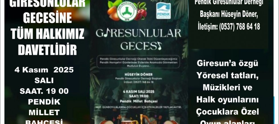 Giresunlular Gecesi”, Pendik Memleket Günleri kapsamında 4 Kasım Salı günü Pendik Millet Bahçesi’nde gerçekleştirilecek. Etkinlikte Giresun’un kültürel zenginlikleri, yöresel tatları ve halk oyunları tanıtılacak.
