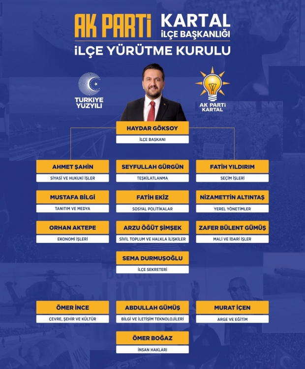 AK Parti Kartal İlçe Başkanı Haydar Göksoy, İlçe Yürütme Kurulu'nu açıkladı. AK Parti Kartal İlçe Başkanı Haydar Göksoy, yeni dönemde görev yapacak İlçe Yürütme Kurulu’nu açıkladı. Haydar Göksoy, 8. Olağan İlçe Kongresi'nde yaptığı açıklamada Kartal'a hizmet etmeye devam edeceklerini belirtti.