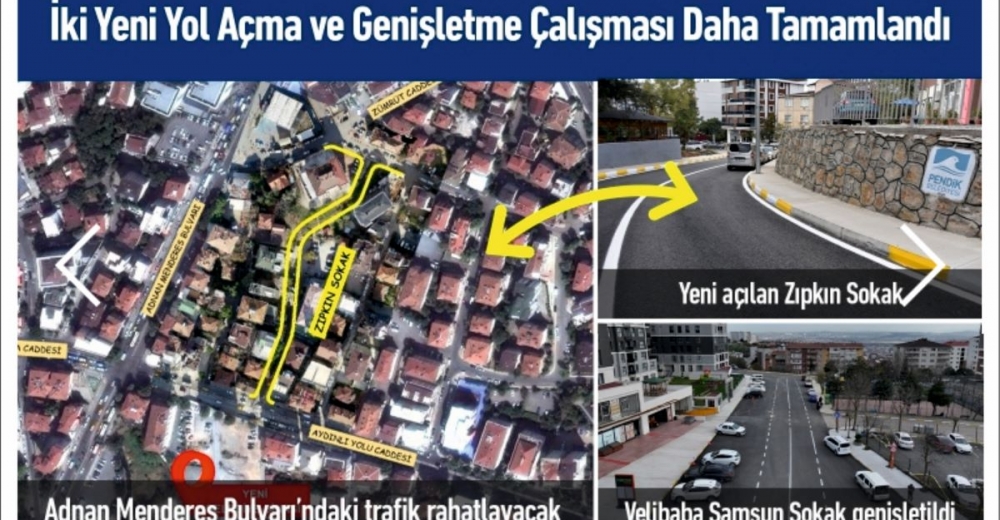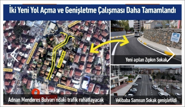 Yeni yol açma ve genişletme çalışmalarını sürdüren Pendik Belediyesi, Adnan Menderes Bulvarı’ndaki trafiği rahatlatacak olan Zıpkın Sokağı trafiğe açtı. Belediye ekipleri bir yandan da Velibaba Mahallesi Samsun Sokak’taki yol genişletme çalışmasını tamamladı.