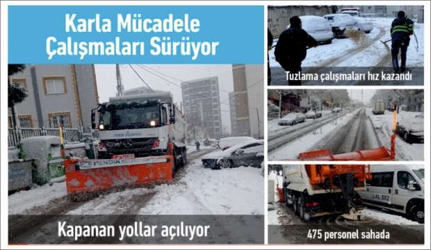 Pendik Belediyesi ekiplerinin karla mücadele çalışmaları sürüyor. Belediye ekipleri sabah saatlerinde artan kar yağışına karşı sahada çalışmalarını hızlandırdı. 475 personel kar nedeniyle kapanan yolları açıyor ve ardından tuzlama çalışması yapıyor.
