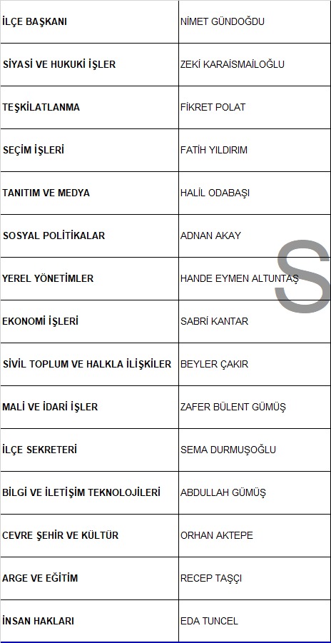 Kartal AK Parti İlçe Başkanı. Nimet GÜNDOĞDU tarafından oluşturulan ve İl Başkanlığı ve Genel Merkez Teşkilat Başkanlığı tarafından onaylanan Yürütme kurulu (İcra Kurulu) listesi açıklandı. Yeni yürütme kurulunun Kartal AK Parti ilçe teşkilatına hayırlı olması dileklerimizle, Yürütme kurulunun tüm başkanlarına çalışmalarında başarılar dilerim.