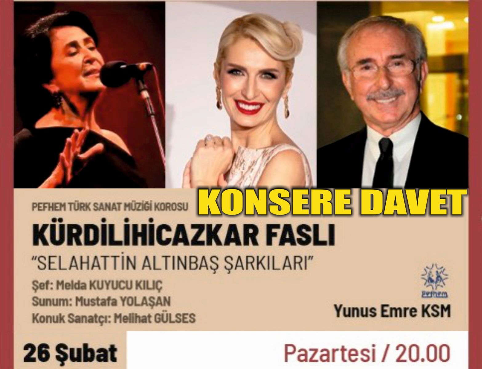Başkanlığını Serdar Özalkak’ın yürüttüğü Pendik Folklor Halk Eğitim Merkezi Derneği (PEFHEM), KÜRDİLİHİCAZKARFASLI "Selahattin Altınbaş Şarkıları" adlı konseriyle tüm müzikseverleri 26 Şubat Pazartesi günü saat 20:00’da Yunus Emre Kültür Merkezi’nde buluşturacak.