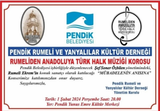 Pendik Rumeli ve Yanyalılar Kültür Derneği, Pendik Belediyesi iş birliği ile "Mübadelenin Anısına” adlı konseri, 1 Şubat Perşembe günü saat 20.00'da Yunus Emre Kültür Merkezi'nde gerçekleşecek.