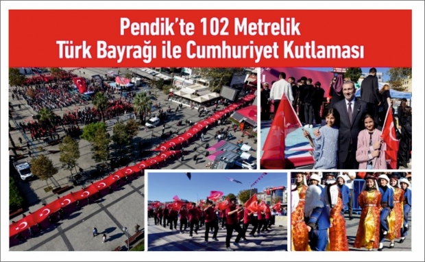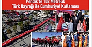 29 Ekim Cumhuriyet Bayramı, Pendik’te büyük coşkuyla kutlandı. Cumhuriyetimizin Kuruluşunun 102. Yıl Dönümü için hazırlanan 102 metrelik Türk bayrağı çarşıda bir kez daha dalgalandı. Vatandaşlarla birlikte kutlamalara katılan Belediye Başkanı Ahmet Cin: “Cumhuriyetimizin 102. Yıl Dönümü'nü büyük bir gurur ve sevinçle kutluyoruz. 102 metre uzunluğundaki bayrağımızla, vatandaşlarımızla birlikte gurur dolu bir yürüyüş gerçekleştirdik. Vatandaşlarımızın ilgisi ve coşkusu gerçekten muhteşemdi.” dedi.