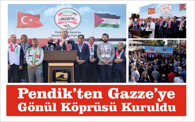 bugün anlamlı bir dayanışma örneğine sahne oldu.Pendik Belediyesi öncülüğünde başlatılan “Pendik’ten Gazze’ye Gönül Köprüsü” kampanyası, Pendik Çarşı Camii’nde cuma namazı sonrasında yapılan basın açıklamasıyla resmen başladı. Kampanya kapsamında 10, 11 ve 12 Ekim tarihlerinde Pendik Belediyesine bağlı 11 sosyal tesisin 3 günlük tüm geliri Gazze’ye aktarılacak. İlçedeki esnaflar da bir günlük kazançlarını bağışlayarak kampanyaya destek verecek. Kampanya 3 gün boyunca devam edecek ve toplanan gelirler, Gazze halkının yararına kullanılacak. Öte yandan Pendik Çarşı’da kampanya bünyesinde STK’lar tarafından kurulan kermeste 3 gün boyunca elde edilen gelir de Gazze’ye gönderilecek.