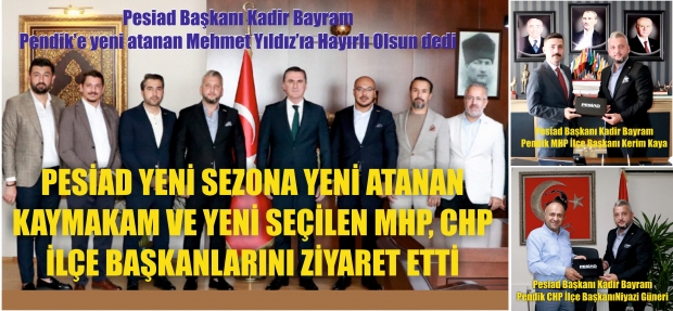 PESİAD yeni sezonun başlamasıyla ilçede ziyaretlere de başladı. PESİAD Yönetim Kurulu Başkanı A.Kadir Bayram ve Genç PESİAD Yönetimi, Pendik İlçe Kaymakamlığına atanan Mehmet Yıldız'a hayırlı olsun ziyaretinde bulundu. Heyet Kaymakam Yıldız'a yeni’ görev yerinde başarılar diledi.
