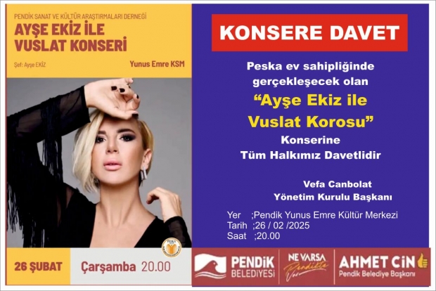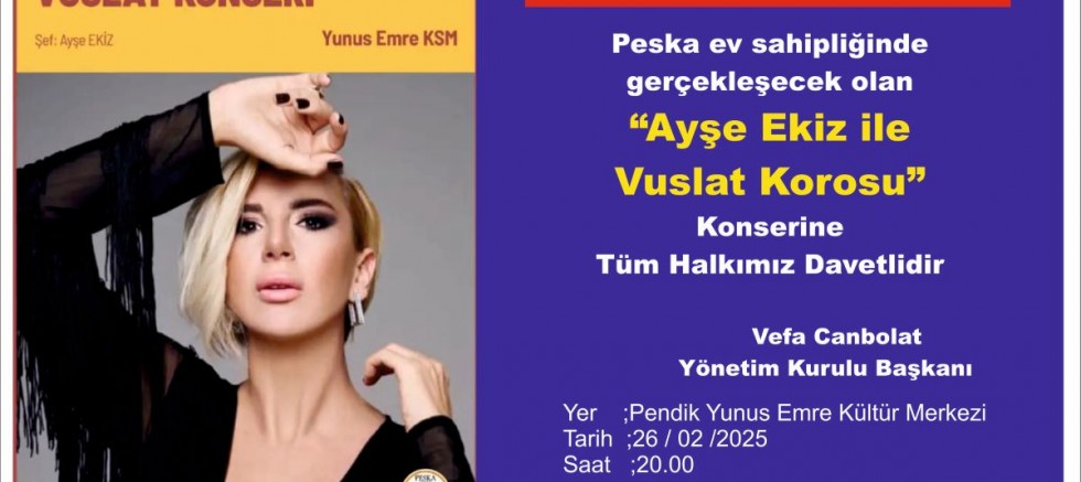 Başkanlığını Vefa Canbolat’ın yaptığı Pendik Sanat ve Kültür Araştırmaları Derneği (PESKA), 26 .02. 2025 Çarşamba akşamı "Ayşe Ekiz ile Vuslat Korosu'nun" Pendik Yunus Emre Kültür Merkezinde vereceği konsere Tüm Halkımızı davet etti.