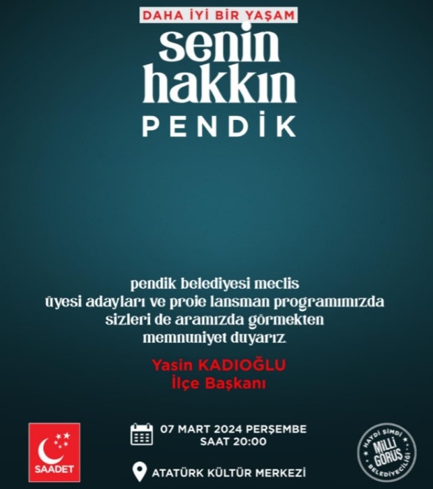 Saadet Partisi Pendik İlçe Başkanlığı, Başkanlığını Yasin Kadıoğlu'nun yürüttüğü, önemli bir etkinliğe ev sahipliği yapmaya hazırlanıyor. Pendik Belediyesi Meclis Üyesi Adayları ve proje lansmanı programı, 7 Mart 2024 Perşembe günü saat 20.00'de Atatürk Kültür Merkezi'nde gerçekleştirilecek.