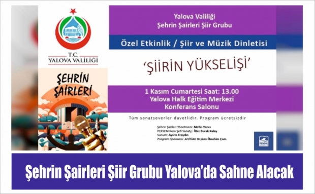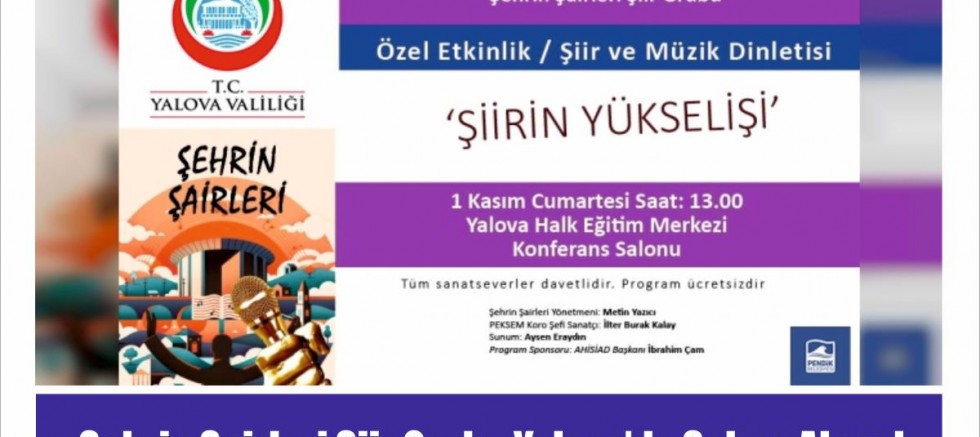 Yönetmenliğini Metin Yazıcı’nın yürüttüğü Şehrin Şairleri Şiir Grubu, 1 Kasım Cumartesi günü saat 13.00’da Yalova Halk Eğitim Merkezi Konferans Salonu’nda (Cevdet Aydın Parkı Yanı) ‘Şiirin Yükselişi’ başlıklı bir dinleti gerçekleştirecek.