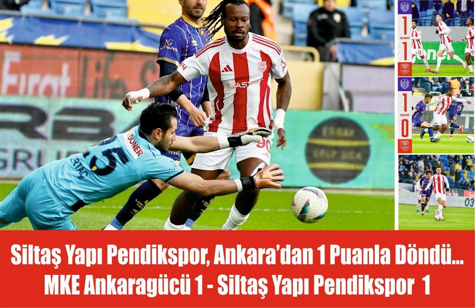 1. Lig 14. hafta karşılaşmasında temsilcimiz Siltaş Yapı Pendikspor, deplasmanda MKE Ankaragücü ile 1-1 berabere kaldı. Mücadelenin henüz 9. dakikasında 1-0 geriye düşen Pendikspor, 57. dakikada Berkay’la bulduğu golle eşitliği sağlayarak maçtan 1 puanla ayrıldı.