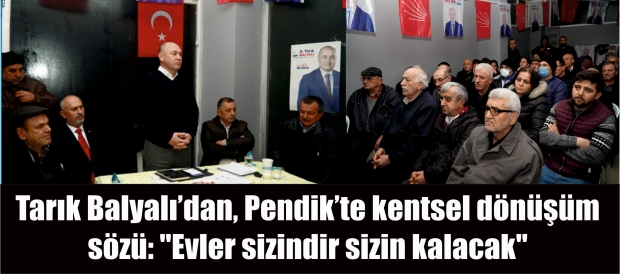 Cumhuriyet Halk Partisi Pendik Belediye Başkan adayı Süleyman Tarık Balyalı, seçim çalışmaları kapsamında Velibaba'da seçmenlerle bir araya gelerek kentsel dönüşüm konusunda vatandaşlara "evler sizindir sizin kalacak" diyerek kentsel dönüşümü kendilerinin çözeceğini belirtti.