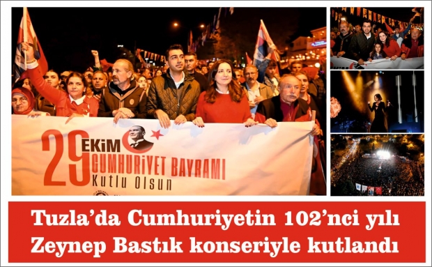 Tuzla’da 29 Ekim Cumhuriyet Bayramı’nın 102’nci yılı büyük bir coşkuyla kutlandı. Fener alayıyla başlayan kutlamalar, sahilde gerçekleştirilen Zeynep Bastık konseriyle devam etti. Belediye bütçesinden harcama yapılmadan, sponsor desteğiyle düzenlenen etkinlikte yüzlerce kişi, ellerinde Türk bayraklarıyla şarkılara ve marşlara hep bir ağızdan eşlik etti.